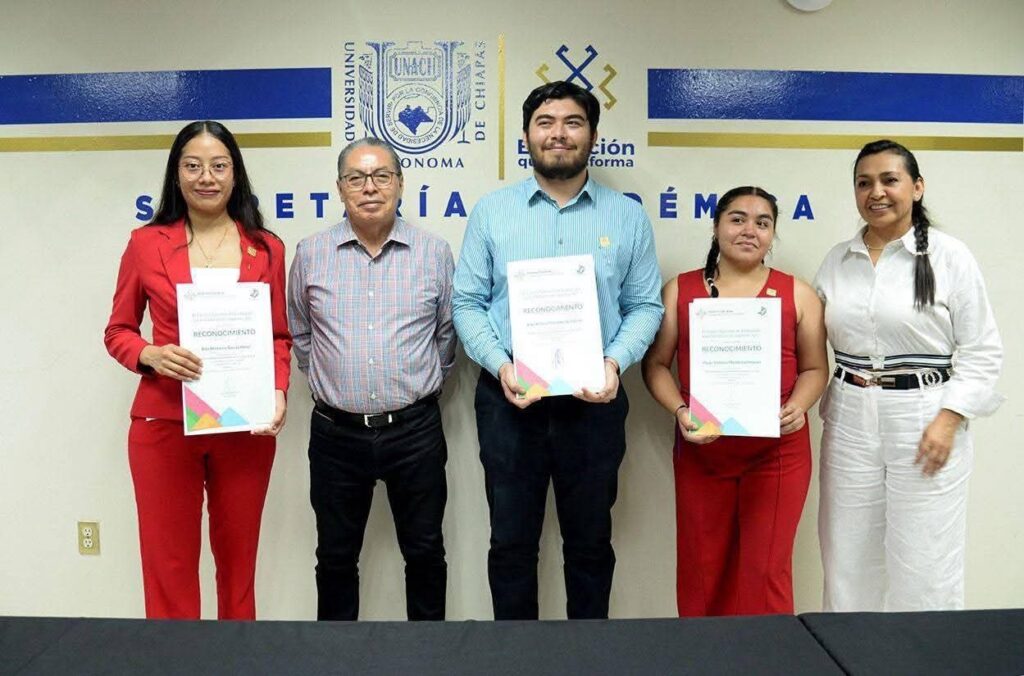 Rita García Pérez, de la licenciatura en Gestión Turística de la Facultad de Contaduría y Administración, Campus l de Tuxtla Gutiérrez y Julio Alvarado de la Cruz y Paola Mendoza Vázquez, ambos de la licenciatura en Derecho de la Facultad de Derecho, Campus lll, con sede en San Cristóbal de Las Casas, recibieron el pergamino correspondiente.