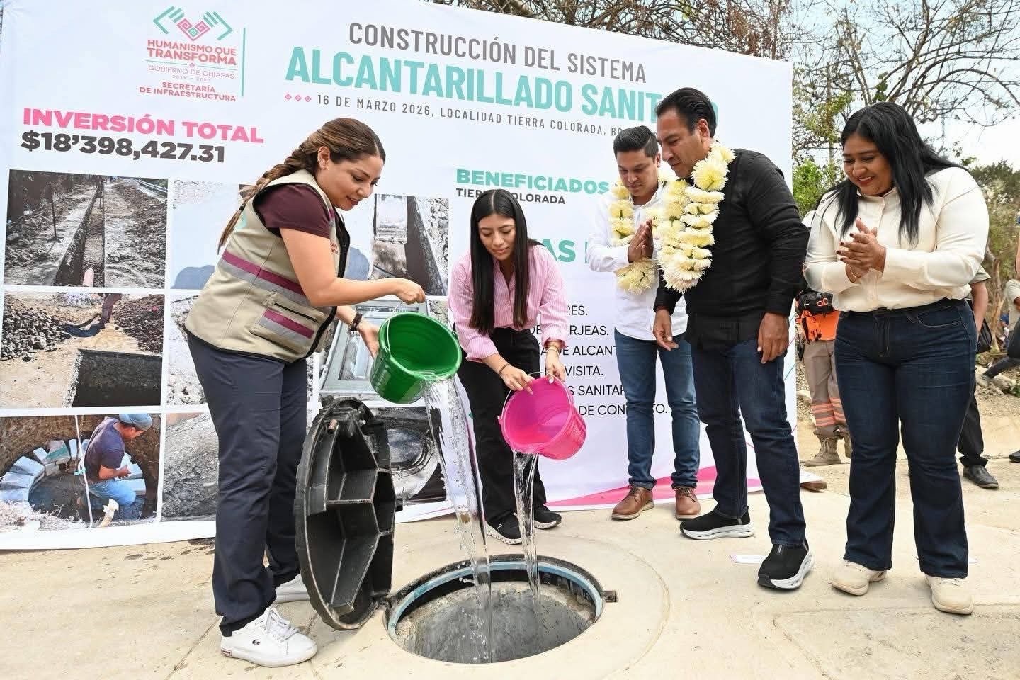 Posteriormente, en el municipio de Bochil, entregó el muro de contención para la reducción de riesgos por deslizamiento de laderas, una obra de protección civil en la que se invirtieron más de 17.3 millones de pesos y que favorece a 14 mil 200 personas de distintos municipios. Más tarde se trasladó a la localidad Tierra Colorada, donde inauguró el sistema de alcantarillado sanitario, infraestructura a la que se destinaron 18.3 millones de pesos y que permitirá mejorar la calidad de vida de más de mil habitantes.