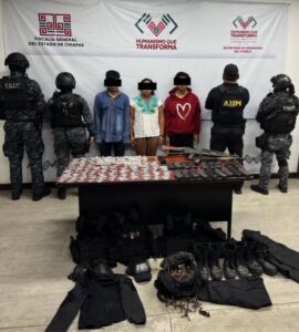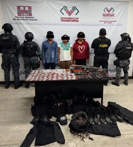En operativo interinstitucional, la Secretaría de Seguridad del Pueblo (SSP) a través de la Fuerza de Reacción Inmediata Pakal (FRIP), en coordinación con la Agencia de Investigación e Inteligencia Ministerial (AIIM) de la Fiscalía General del Estado (FGE) y la Secretaría de Seguridad y Protección Ciudadana (SSPC) del Gobierno Federal, detuvieron a tres personas con armas de fuego y presuntas drogas en Ocozocoautla de Espinosa.